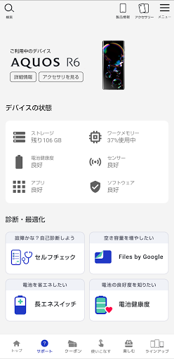 문제 해결을위한 FAQ 및 명령어 매뉴얼, 실패라고 생각할 때 진단 기능, 더 긴 배터리를 지속하는 기능 및 스마트 폰 케이스와 같은 액세서리 등과 같은 지원 정보 .