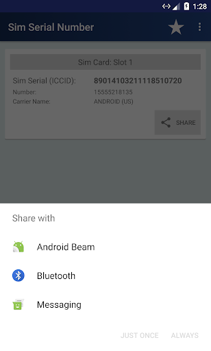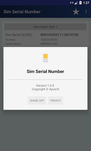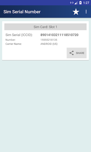 Simple and quick application to extract the SIM Serial Number, in other words, ICCID (Integrated Circuit Card Identifier) of the SIM Card(s) installed on the phone or Tablet. ICCID is generally written on the backside of the SIM card. This information is prone to damage by many means, like: Cutting of SIM to support micro or mini card slots, rubbing of the back of the card to and from SIM Slot, etc. This application will be handy to check the serial number. The extracted information can be shared with others.