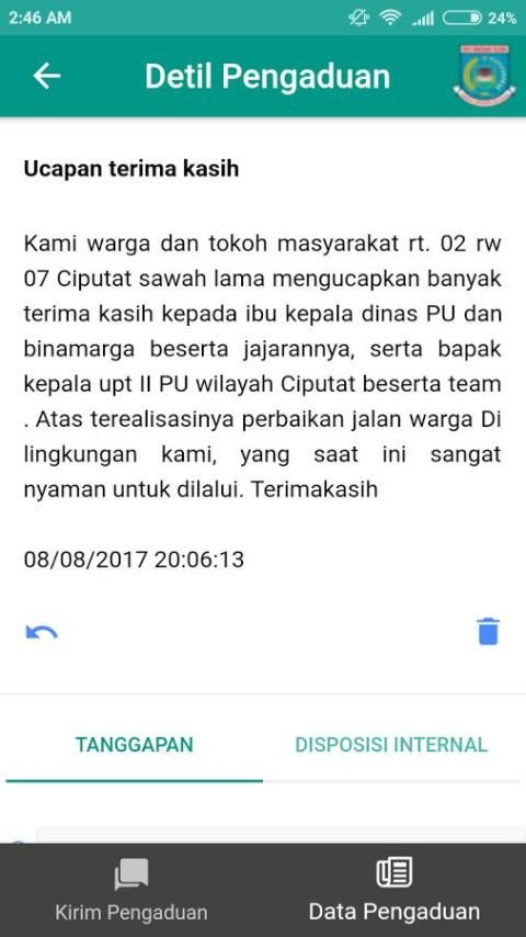 Laporan anda telah ditindaklanjuti dan terimakasih atas partisipasi anda,mari menata tangsel rumah dan kota kita.
