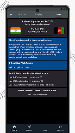 In this screen we update pitch report for upcoming or today's match with Cricket stadium records and head to head stats. In the pitch report section we provide pitch report according the previous records and then official pitch report during the live game.