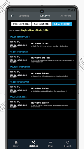 IND vs ENG Test matches series to start from 25th January 2024 and in this app you will get India vs England live Cricket score. Stay updated with live IND vs ENG match, playing 11, pitch report stats and also check IND vs ENG schedule, IND vs ENG results in the app.