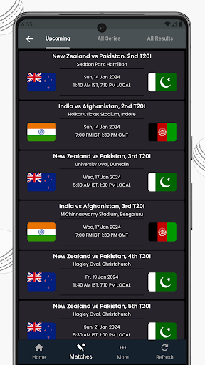 Know upcoming matches and all Cricket series full time table in this screen.