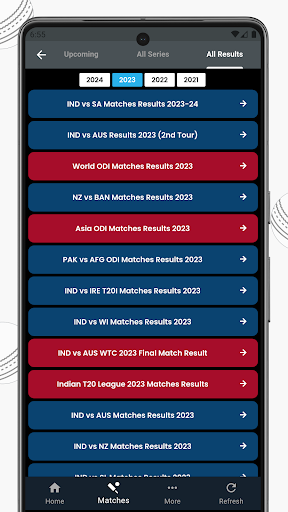 We have records of all recent and history Cricket matches results updated in this screen. You will able to check each match highlights and scorecard for all bilateral series, T20 Leagues and World Cricket ODI and T20I tournaments.