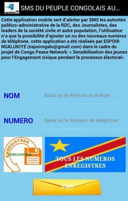 PEOPLE SMS is an application containing the telephone numbers of the political and administrative authorities and leaders of civil society in the DRC, its role is to alert these people by SMS that they influence or to take decisions on what happens in our framing environments with peace democracy and the electoral process.