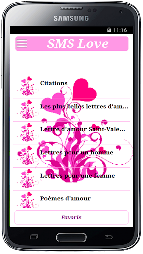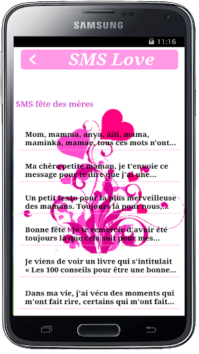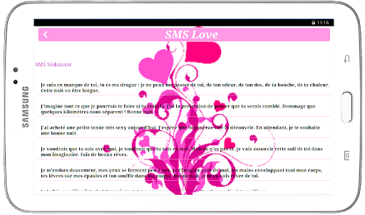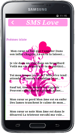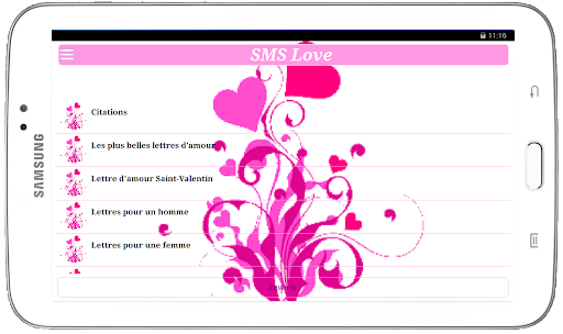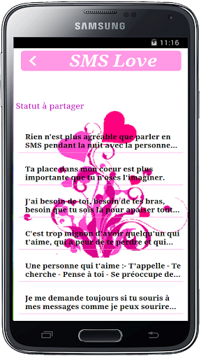 Grâce à cette application vous n'aurez plus à écrire des sms pour votre amoureux (se) il suffit d'ouvrir l'application et choisissez votre sms pour exprimer votre sentiment.