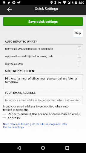 ✔ Setup multiple rules for auto reply (by SMS keywords/by missed calls/by rejected calls) with different reply contents to match your scenes.