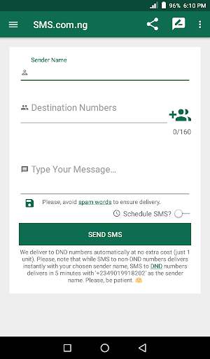 Send bulk SMS to all networks in Nigeria including DND numbers at no extra cost (1 unit = 1 SMS to all numbers including DND numbers). No Hidden Charges; No Subscriptions; No Gimmicks; No one else, but SMS.com.ng do this in Nigeria.
