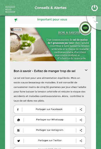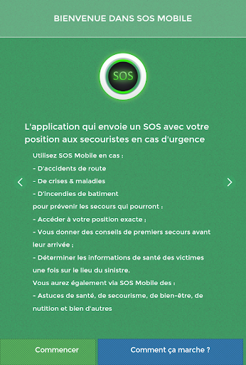 SOS Mobile helps you in emergencies, including crises and illnesses on the street or at home of a relative or yourself, in case of road accidents (you as a witness or a victim) And fires (you yourself as a witness or victim). With SOS Mobile, your position is located and sent to the emergency department who will intervene quickly at the scene of the disaster and who will be able to give you first-aid advises in real time before rescuers' arrival. SOS Mobile is currently functional in Togo (a West African country).