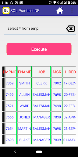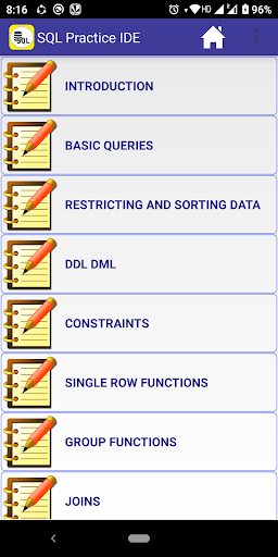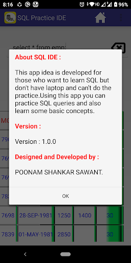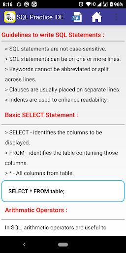This app is very useful for those who wants to do practice of SQL but don't have laptop or software. They can do practice easily using this app.Any Non-Technical person can learn SQL from this app. First understand the concepts by using Notes tab and then do the practice using Editor.