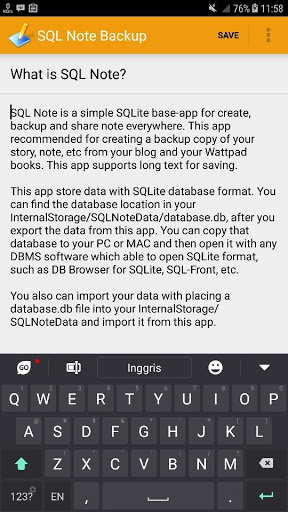 A simple SQLite base-app for create, backup and share note or article everywhere. This app recommended for creating a backup copy of your story, note, etc from your article, blog and your Wattpad books. This app support long text for saving.