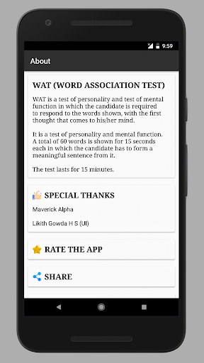 WAT is a test of personality and test of mental function in which the candidate is required to respond to the words shown, with the first thought that comes to his/her mind. It is a test of personality and mental function.
