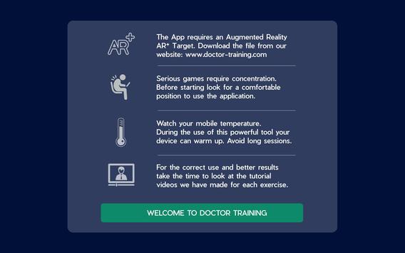 DOCTOR TRAINING uses recognition technology and image tracking with a camera integrated in any smart device (mobiles, tablets) running on iOS and Android platforms.