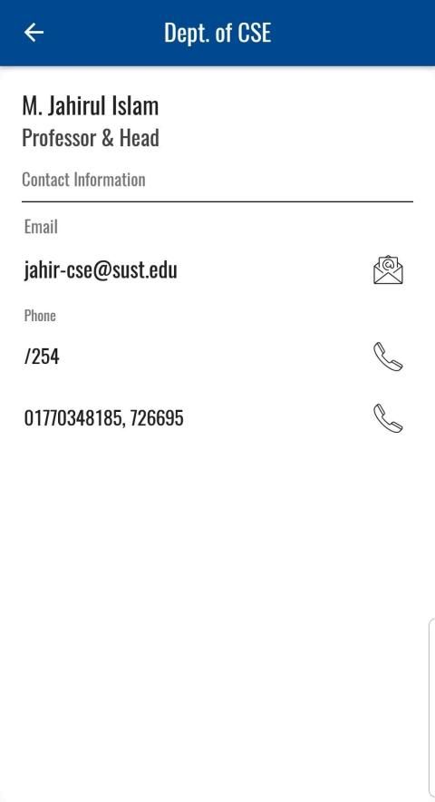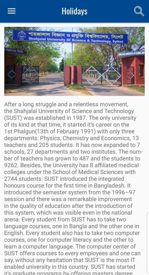 SUST DIARY provides access to up-to-date phone numbers and email addresses of all the faculty members, officers and other staffs of Shahjalal University of Science & Engineering. You can search or navigate through the list to call or email someone directly from this app. One can get the list of all holidays of our campus. If there is an update in the data, this app will automatically be updated via the internet.