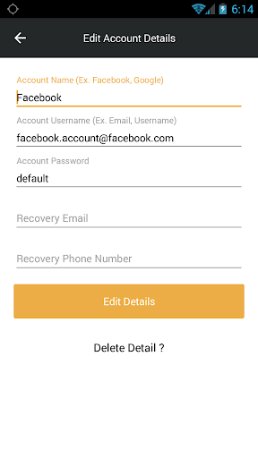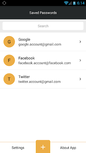 Use this awesome application to save your different account's passwords. Now you will not need remember all passwords of your different accounts just remember one master password and all your password will be on your hand. We are not storing your saved passwords on our server. it will be stored on your phone so your account details are safe.