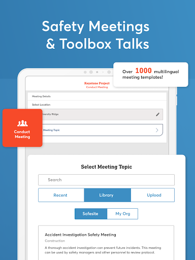 by conducting digital safety inspections, audits, and checklists on-the-go. Upload your custom forms or choose common OSHA safety inspections from our library of verified templates. Then go beyond compliance with incident reports, toolbox talks, equipment tracking, hazard management, and much more! Administrative users can use the desktop-based safety management dashboard to manage and track engagement and review safety data in real-time with powerful reporting.
