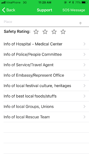 • SafetyFirst also assists user to access to lots of helpful information when travelling around the world ie. Location safety's score, Info of Festival, Culture Heritages; Info of Police/People Committee; Info of Service/Travel Agent; Info of Restaurant/Shopping Mall; Info of best local foods/stuffs; Info of Embassy/Represent Office; Local safety areas; Info of local Groups, Unions; Info of Local Search and Rescue Team.