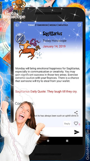 This Sagittarius Daily Horoscope App has a cozy design and easy to use. Here you will find Horoscopes of all kinds but for your Zodiac sign Sagittarius only. Just pick a Daily Horoscope, Yearly forecast or watch the Video Daily Horoscopes for your Zodiac sign Sagittarius. In Daily Horoscope activity, you will find not only Today Horoscope but Tomorrow Horoscope, Weekly & Monthly Horoscope as well, simply slide from one Horoscope to another. In addition, you have the ability to share your experience with other Sagittarius’s whether via your favorite messenger or right at the bottom of each page via the build in comments.