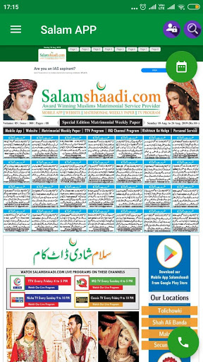 Salamshaadi providing services through Website, Weekly Matrimonial Paper and Live Matrimonial TV Programs is emerging as one of the India’s most trusted brand for matchmaking services and remarkably known for world’s most deserving matchmaking Service Provider and now started to serve people through user friendly android application.