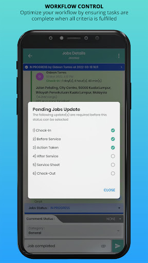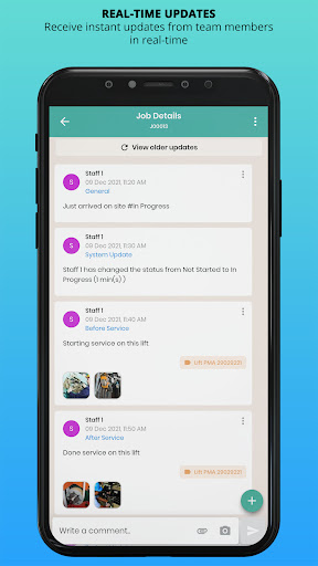 Receive instant updates from team members in real-time, showing job updates and statuses for each job, including check-ins for site arrival.