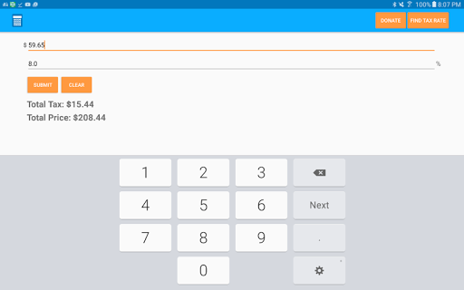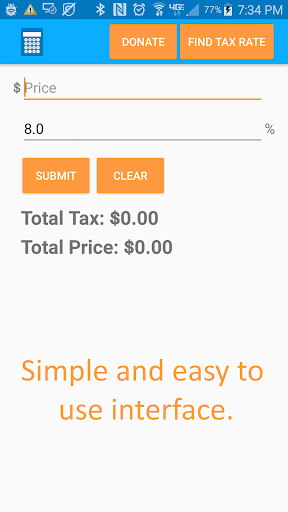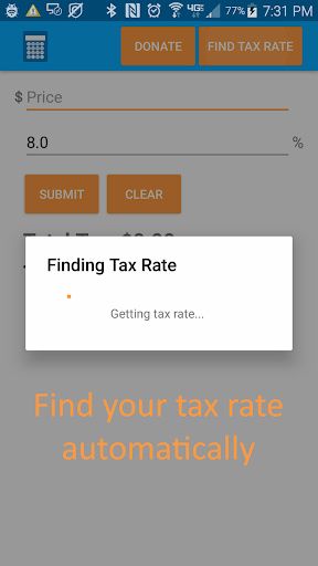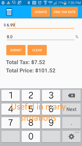 Internet: Used to retrieve tax rate data. Also for simple app analytics and one unobtrusive ad banner (any donation removes the banner).