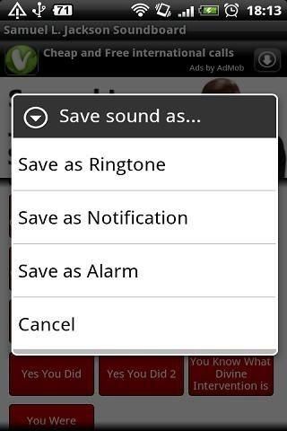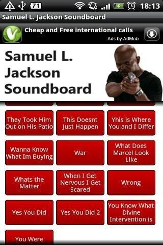 Here's a Samuel L. Jackson Soundboard consisting of over 50 quotes! You can save sounds as Ringtones, Notifications and Alarms by long pressing on a button. This app will by default install to an SD card. Enjoy! Version 1.1 Added Post Review Menu Option