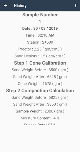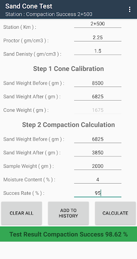 Sand Cone Test is an important test for road construction in fill layers that can check if the compaction of the layer more or less than the allowable compaction of the layer , this a simple application can calculate the compaction in site with most used units and store it with all data of km , all required weights and success rate and sample result , it's date , time and sample number , easy to use and flexible .