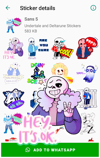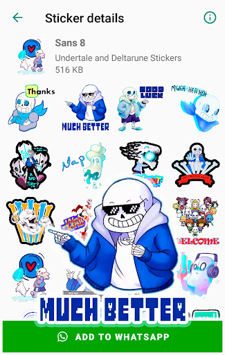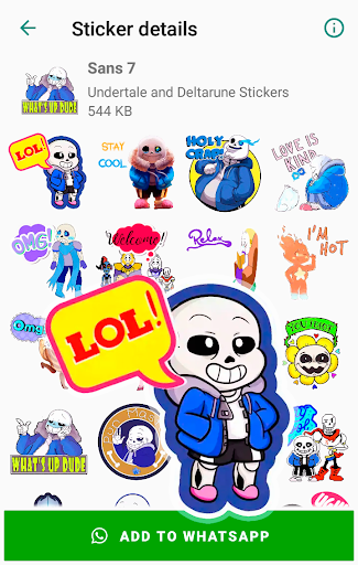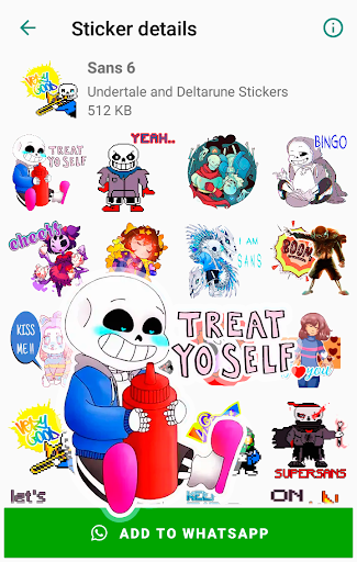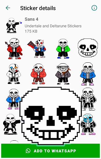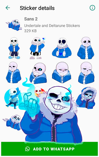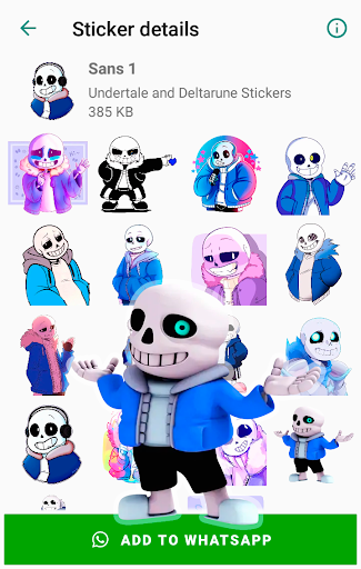 This app contains a large collection of packs of Sans Undertale Stickers for WhatsApp. Undertale and Deltarune Sans for WhatsApp stickers collection, with many different stickers set. Now express yourself using awesome Undertale Sans Stickers with WAStickerApps.
