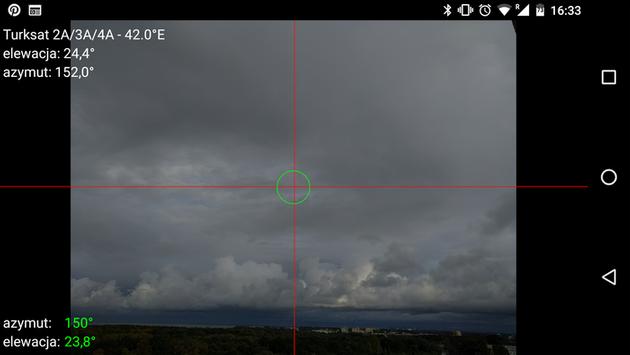 The azimuth, elevation and skew angle is calculated for your location and chosen satellite. Under calculated values there is a compass with graphical representation of azimuth angle. The azimuth angle is calculated with magnetic inclination. Remember – every time you use compass – you should calibrate it. Green line represents your phone azimuth. So if on compass green and red indicators are on each other – front of the phone should show you direction to the satellite. If the compass value is correct – phone azimuth value will go green.
