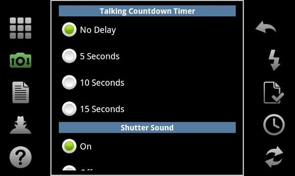 Snap your photos in six ways: 1) Normal Click that responds with voice according to settings 2) Long press for a quick snapshot and save 3) Ask the camera to take a picture 4) Stealth Mode 5) Shake & Snap Mode 6) Talking countdown timer (a big favorite).