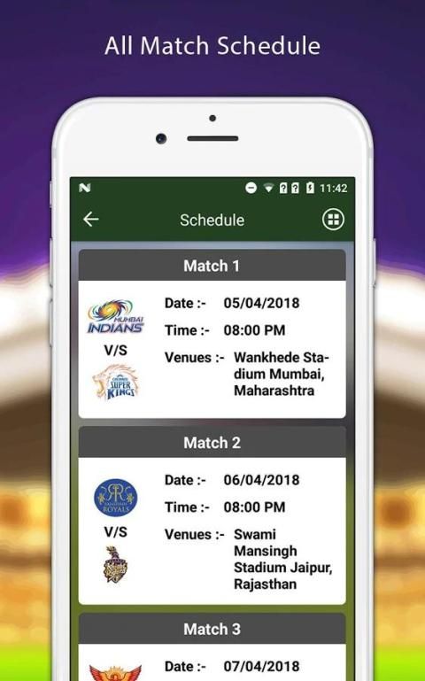 is an app gives the complete schedule for 2018 IPL cricket season, with the help of this IPL 2018 schedule app you can know about the match details, team details, team squad, live score details entirely in one area.