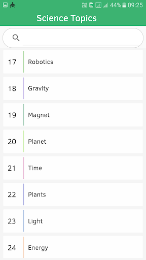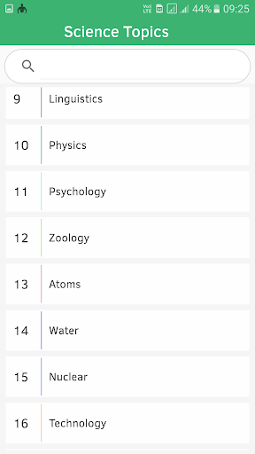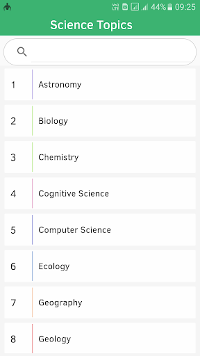 Science facts of each topics like:Astronomy,Biology,Chemistry,Cognitive Science,Computer Science,Ecology,Geography,Geology,Linguistics,Physics,Psychology,Zoology,Atoms,Water,Nuclear,Technology,Robotics,Gravity,Magnet,Planet,Light,Energy,Sound.