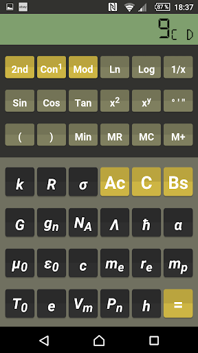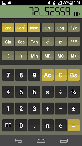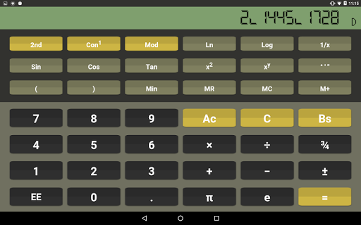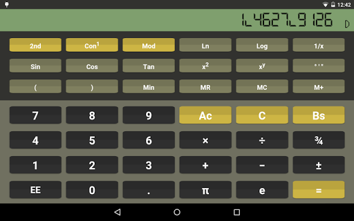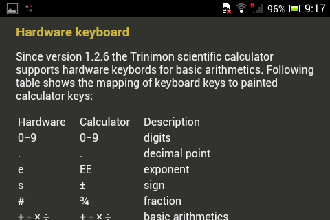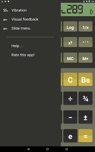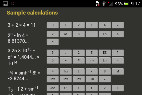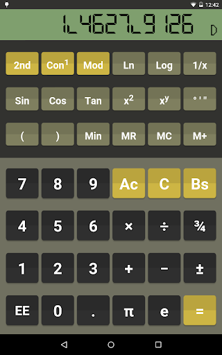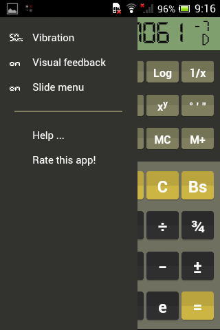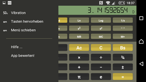 This calculator features landscape and portrait orientations in a pleasing look and feel. Thanks to its smart layout engine the user interface stays always clear independently of different screen sizes. Usage is very similar compared to a usual hardware calculator. If present feel free to use your physical keyboard. Haptic and visual feedback can be toggled in the menu. The calculator offers the following features and functions: