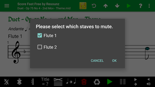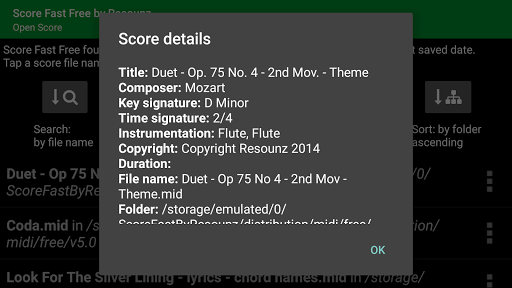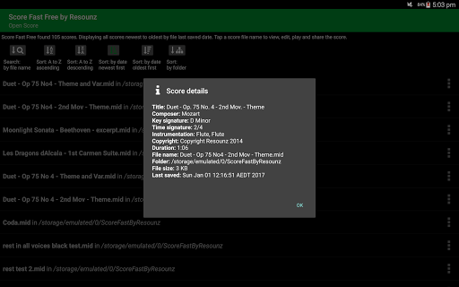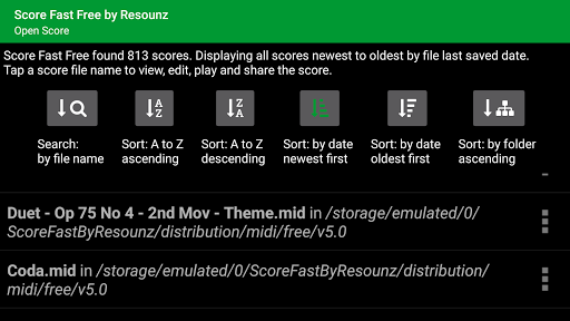 - When selecting an existing score to open you can listen to any score, view details about any score, and delete any score.