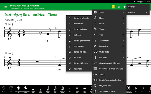 - All editing “options” are displayed in a scrollable row that can be easily shown/hidden. All editing options are also available in menus. The most common editing options are always available above the score. You can use whatever is most convenient to you.