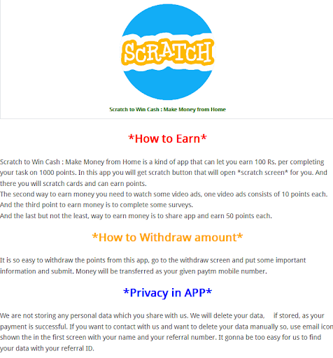 Scratch to Win Cash : Make Money from Home is a kind of app that can let you earn 100 Rs. per completing your task on 1000 points. In this app you will get scratch button that will open *scratch screen* for you. And there you will scratch cards and can earn points.