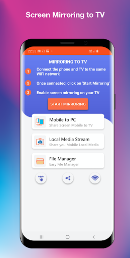 The Screen Mirroring Assistant app supports full screen sharing from Android devices to the TV and also supports miracast wireless display adapters like Chromecast, FireTV, Roku and Anycast.