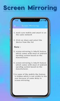 App will assist you to scan and mirror your android phone or tab's screen on smart TV/Display or Wireless dongles or adapters. Screen Mirroring Able to play videos, music, photos, etc in my Smartphone with any devices like smartphone, smart TV, laptop, tablet, etc at anywhere.