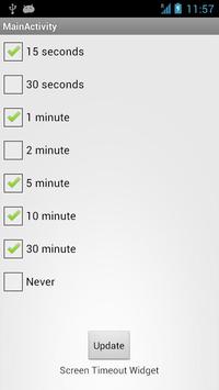 Screen Timeout Widget helps you set the screen timeout value using a simple widget. Just Click on the widget to toggle between the various values. There is more to it. Get inside the application and set the values that you want to be available in the widget. Makes your life easier. Need not traverse a long set of options to set the screen time out. Do it right away from your home screen. There is also an extra option for never letting the screen sleep, it will be always awake.