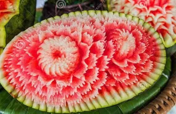 decorative trim, flat or table sculptures of fruits and vegetables have the advantage of transforming food into flower, animal or landscape with a single drawn stencil, a knife of office or peeler.