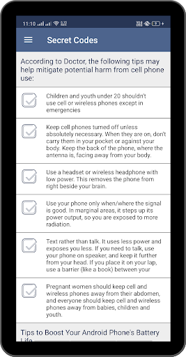 app also contain the mobile tips including the safety tips, battery tips and general tips.