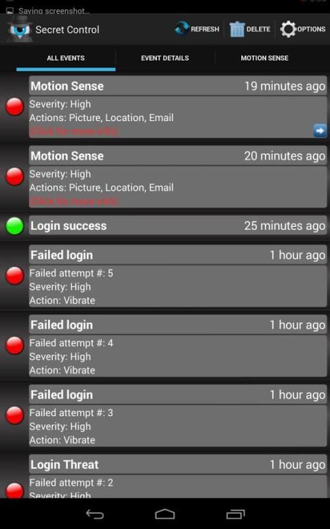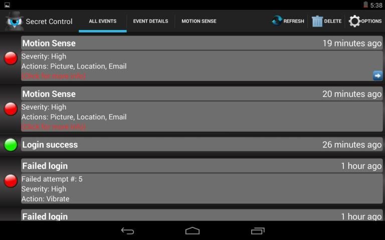 Motion Sense: Have you ever wondered that someone is trying to access your phone in your absence? If you would like to catch the culprit in the act of stealing your phone Motion-sense anti-theft alarm is for you. Once activated you can leave your device alone and Secret Control app will ring alarm, take picture from front facing camera and report location of the device via the email when someone tries to move/pick-up your device. There is also a silent mode if you do not want the alarm to ring.