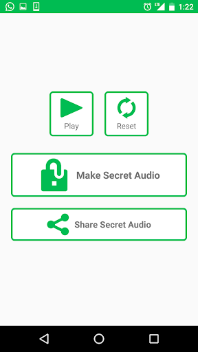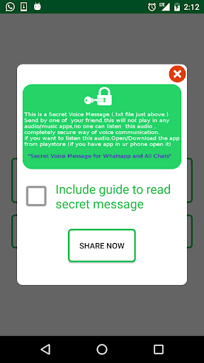 Secret Voice Message for Whatsapp and All Chats, this app will help you to create Secret Voice/audio and you can send it over all chats like whatsapp,facebook,gmail,viber,messenger and all other chat and social media apps. if you are sending Secret Voice no one can read this , only the person who you are sending to this can read , it is completely safe solution to send a encrypted voice message to anyone, if you sending any encrypted voice /audio no one can understand it , and none of the music player cant play the audio, in simple its safe no one can access it without your permission. you can set your own password to open the app, once you setup your password you can start making the secret audio and send it over anything. to create any secret voice you need to give your user name , this user name only will show in the other user end, so please give appropriate user names which will help other persons to understand you.