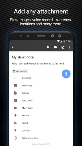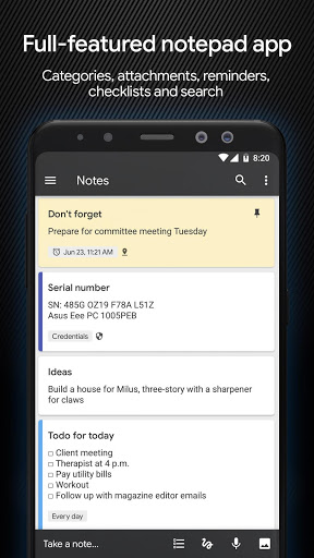 ✔ It's a full-featured notepad app with categories, attachments, reminders, search and professional encryption. The military-grade AES 256-bit encryption guarantees that your data is safe no matter what.