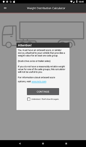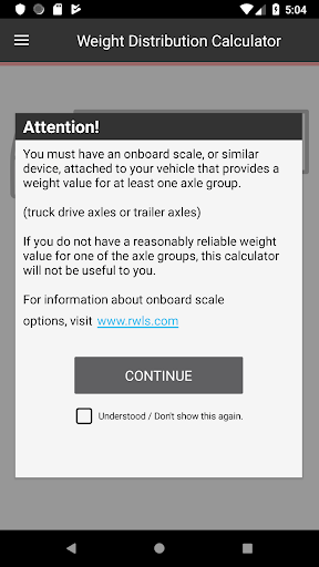 "A helpful tool for truck drivers to calculate the weight of drive or trailer axle groups. This app is to be used in conjunction with one on-board load scale, where only one axle group weight and the total commodity (BOL) weight is known.