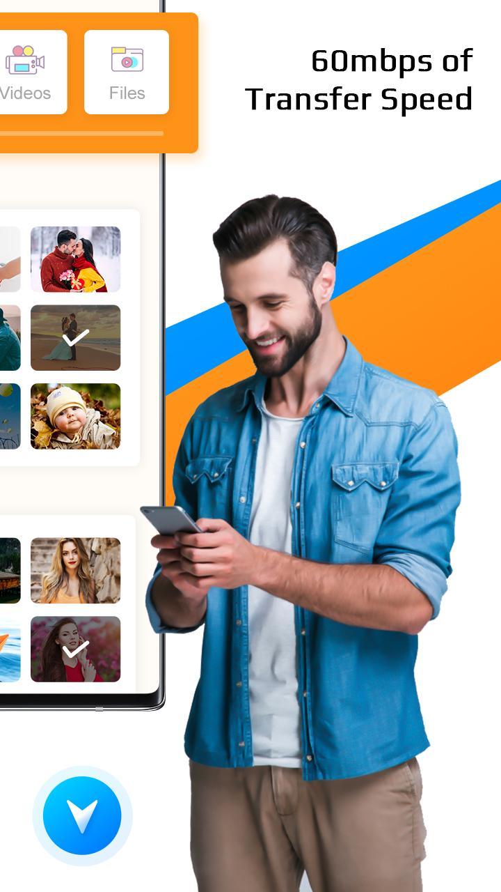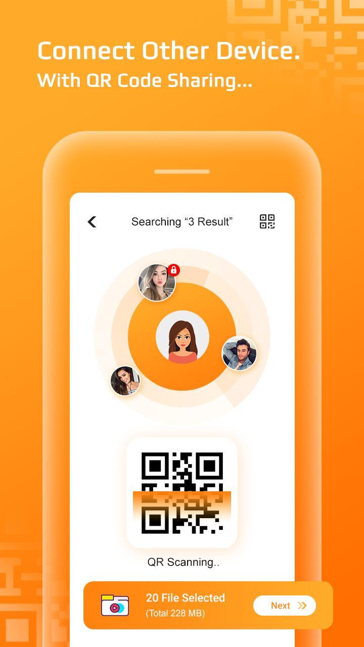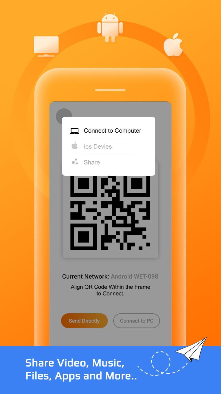 Just connect two devices by creating QR code and select videos, party photos, music, apps & e-book, pdf files or anything, it will stably transfer them at a faster speed, even without the network.