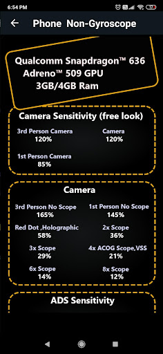 Sensitivity settings: Camera, Ads, Gyroscope, Non-Gyroscope and All Scopes.