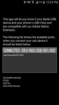 This is a compatibility test application for our Serial to USB Adobe Native Extension, the extension let's you connect your apps directly to Arduinos, and UART interfaces using your device's OTG port. If you don´t know if your phone has USB Host capabilities or if a serial interface is supported by our ANE, then this app is great for you.