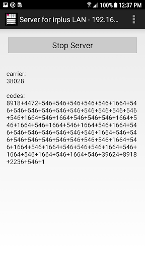 Using this app could not be easier. Just install it on your IR-equipped device, enable wifi, open the app, note the server's IP & port on the title bar (might help to see this using landscape mode), and press the Start Server button. Position your IR-equipped device somewhere with a good line of sight to the components you wish to control (I point it at my entertainment center) and you are ready to use binarymode's app on another device to send IR codes to this app for transmission.