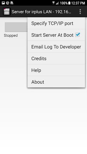 The menu in this app provide limited options. The one that I find important is the checkbox to have this app's server run automatically after each device boot. That way it should be ready when you are. However, please be aware that some devices have been found that do NOT properly notify apps when the boot process is complete. I know that the BLU Vivo XL2 is one such device. This is due to the device maker's decisions not mine and there is nothing I can do about it.