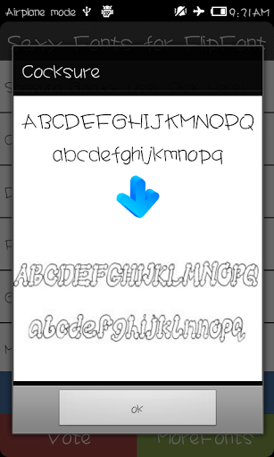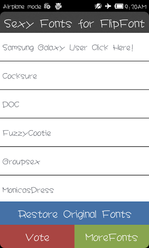 Sexy Galaxy Font Pack FlipFont6-Font Sexy Font Pack for the FlipFont® program will install new fonts on your phone.This is the author of the latest development of the most comprehensive font straight installed packages directly support Samsung Galaxy series (besides google developer series phones)and all Rooted phone.Perfect replacement font, make your launcher, QQ, micro-channel, meager full of personalityBefore using this software, please carefully read the following instructions:(1) If your phone is Samsung Galaxy series phones, then click on Settings -> Display -> Font Style.FlipFont program on your phone is compatible.(2) If your phone is not a Samsung Galaxy series phones, you need to put the phone Rooted, gain system privileges to use this software. For Root, via computer terminal landing http://sj.qq.com/root, which has a convenient one-click Root tool If the phone is already root, just click the font name button, a key substitute fonts.If you are not satisfied with the font, click the Restore fonts, the software will help you to restore the default font.Please note If you are using Root way change font, every time you change the font, you need to restart your phone, change the font to succeed.Disclaimer: This software and FlipFont, independent institutions such as the Samsung Galaxy, all FlipFont, Galaxy trademarks copyrights belong to their relevant institutions.This android application is not affiliated with FlipFont® or Monotype Imaging Inc. All functionality, trademarks and copyrights remain the property of their respective ownersRelated Searches Include: flipfonts , flipfont free for android , flipfont for free , FlipFont FREE , flipfont free , FlipFont free , Flipfont free , Flipfont Free , flipfont free,Galaxy font,font,handwriting font,handwriting fonts,comic fonts,comic font,cute,font free,android font,gothic font,cute font